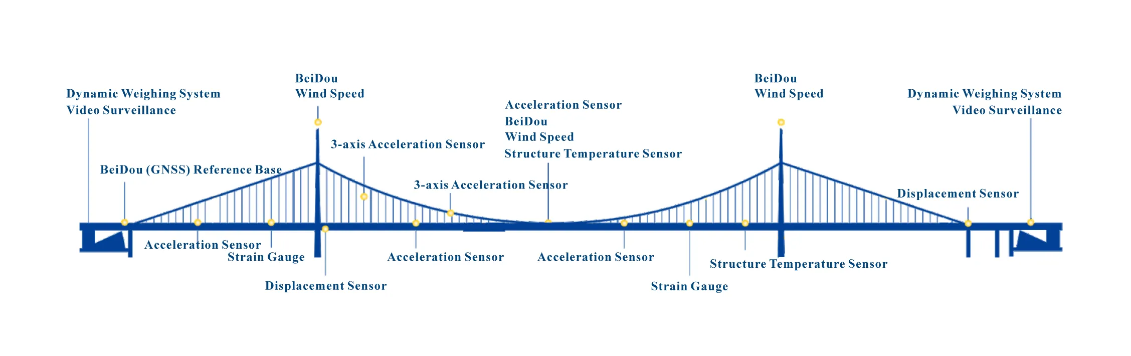 Postavljanjem različitih senzora, uređaja za prikupljanje podataka i opreme za prijenos na konstrukcije mosta, provode se dugotrajna automatska mjerenja učinaka opterećenja mosta, utjecaja na okoliš i odgovora konstrukcije. Izmjereni podaci prenose se na platformu u oblaku putem žičnih ili bežičnih komunikacijskih tehnologija, pružajući korisnicima usluge kao što su daljinsko praćenje konstrukcije mosta, rano upozorenje na mreži, procjena stanja i podrška pri odlučivanju.